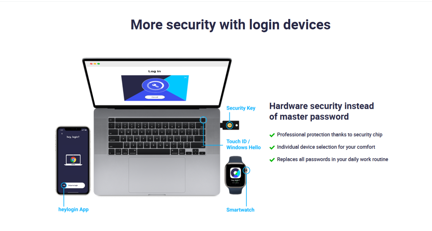 - Quick Confirmation: Instead of typing a password, you can just open the heylogin app on your phone and swipe to log in! No phone? No problem—use a security key, Touch ID, Windows Hello, or even your smartwatch.