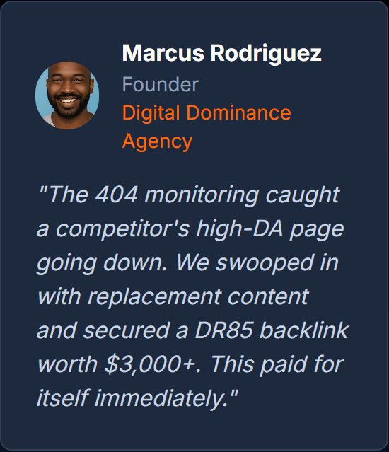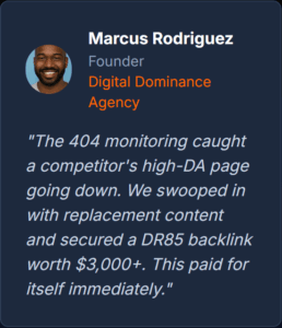 404 Surveillance System: Detect dead pages instantly and swoop in before your rival scans react.