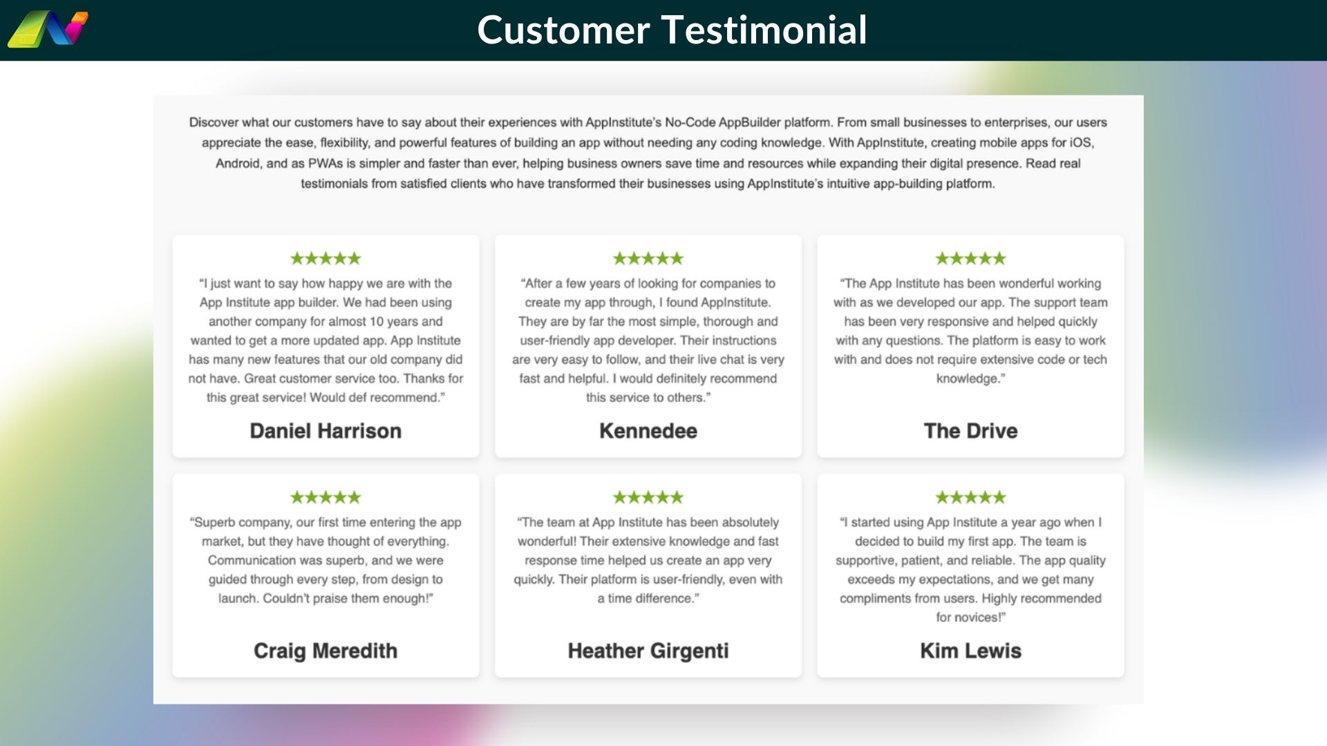 I just want to say how happy we are with the App Institute app builder. We had been using another company for almost 10 years and wanted to get a more updated app.
