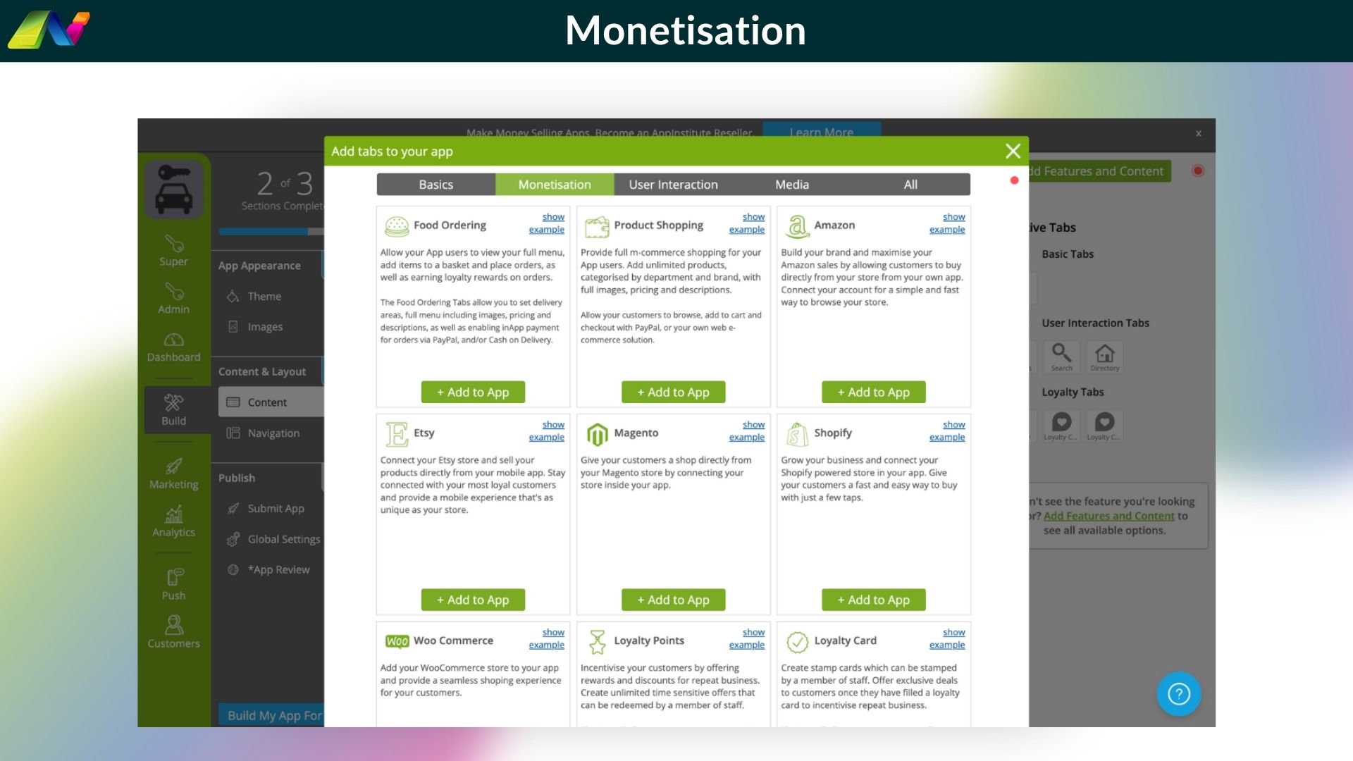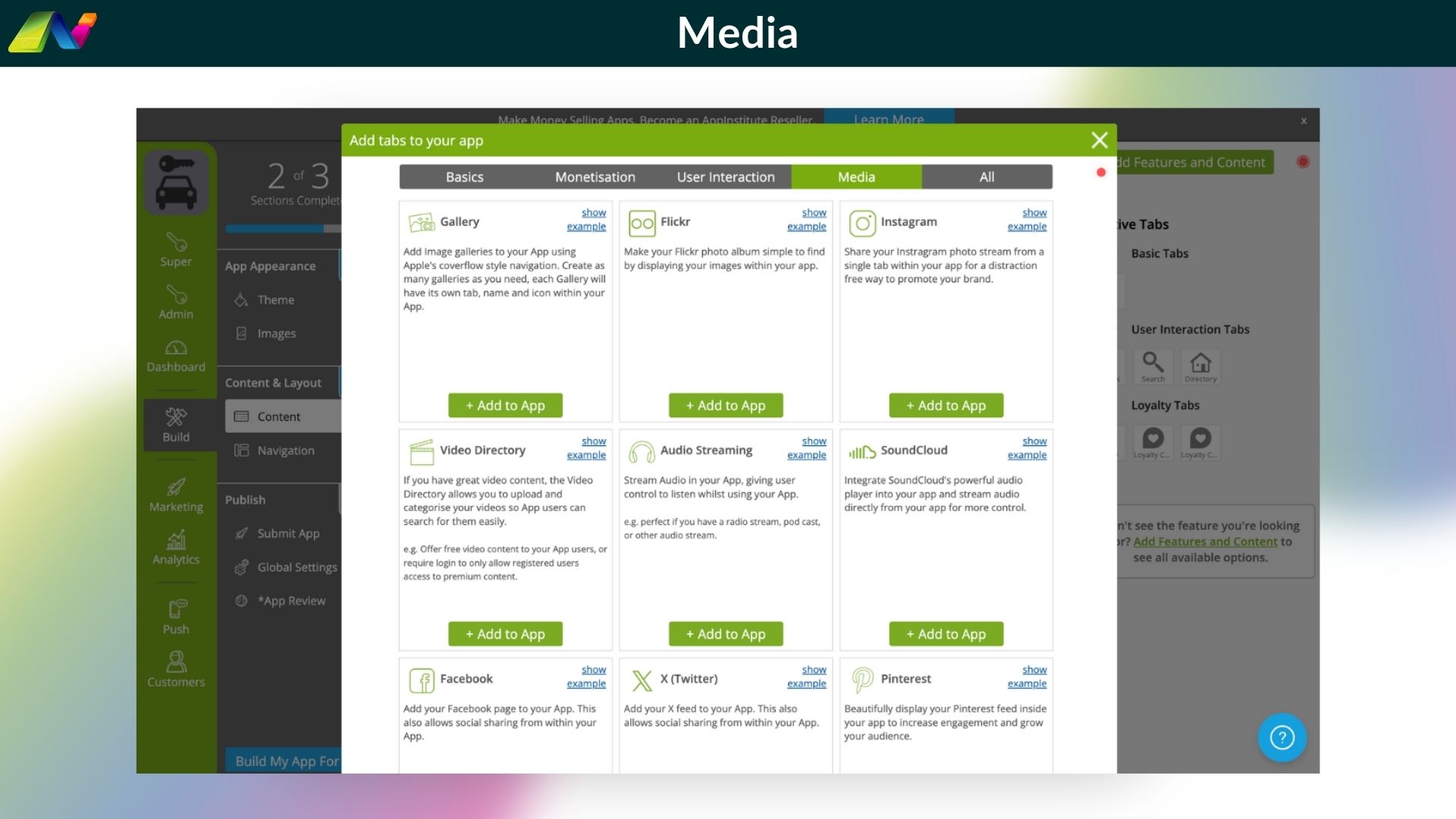 AppInstitute’s reseller program allows you to create and sell white-label iOS, Android, and PWA apps under your own brand with a simple drag-and-drop mobile builder.