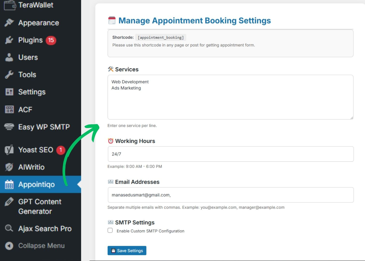 - Navigate to the Appointiqo settings in your WordPress admin area.
