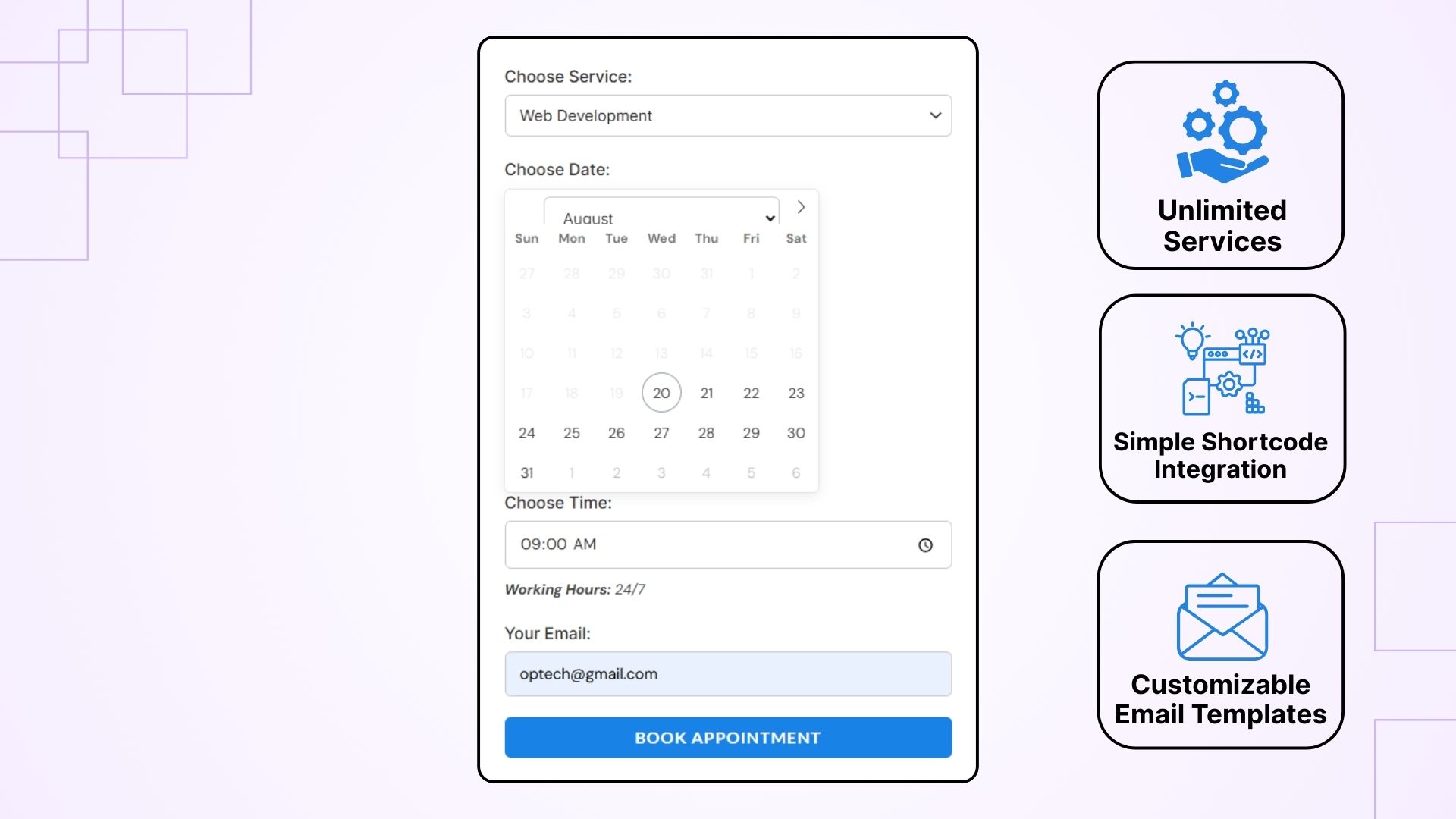 - Pick Date and Time: An intuitive date and time picker will allow them to select an available slot within your configured working hours.