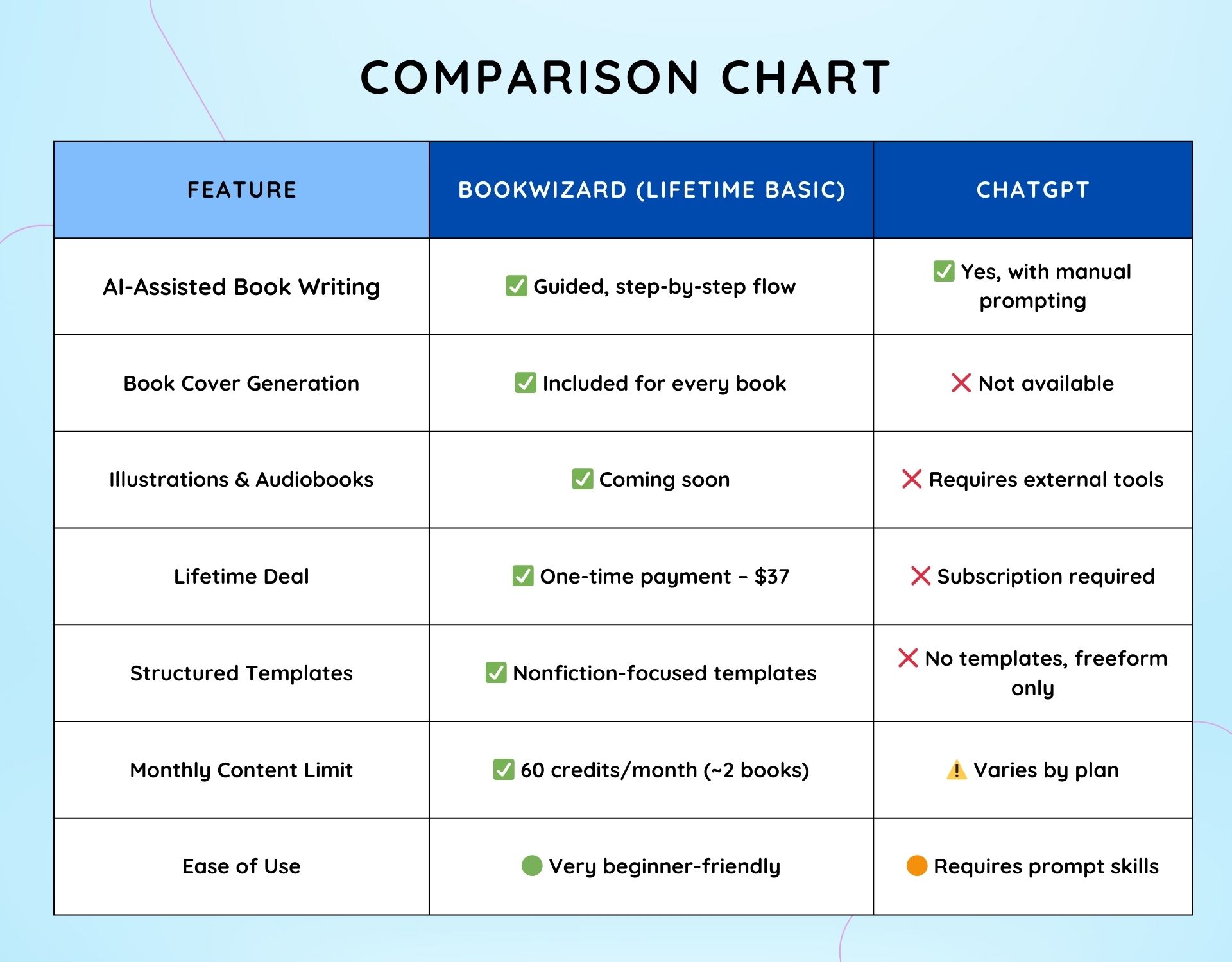 What I love most about BookWizard is its simplicity. You don’t need to worry about remembering complex prompts or mastering the art of prompting gen AI The system is idiot-proof. Overall, BookWizard is a game-changer!”
