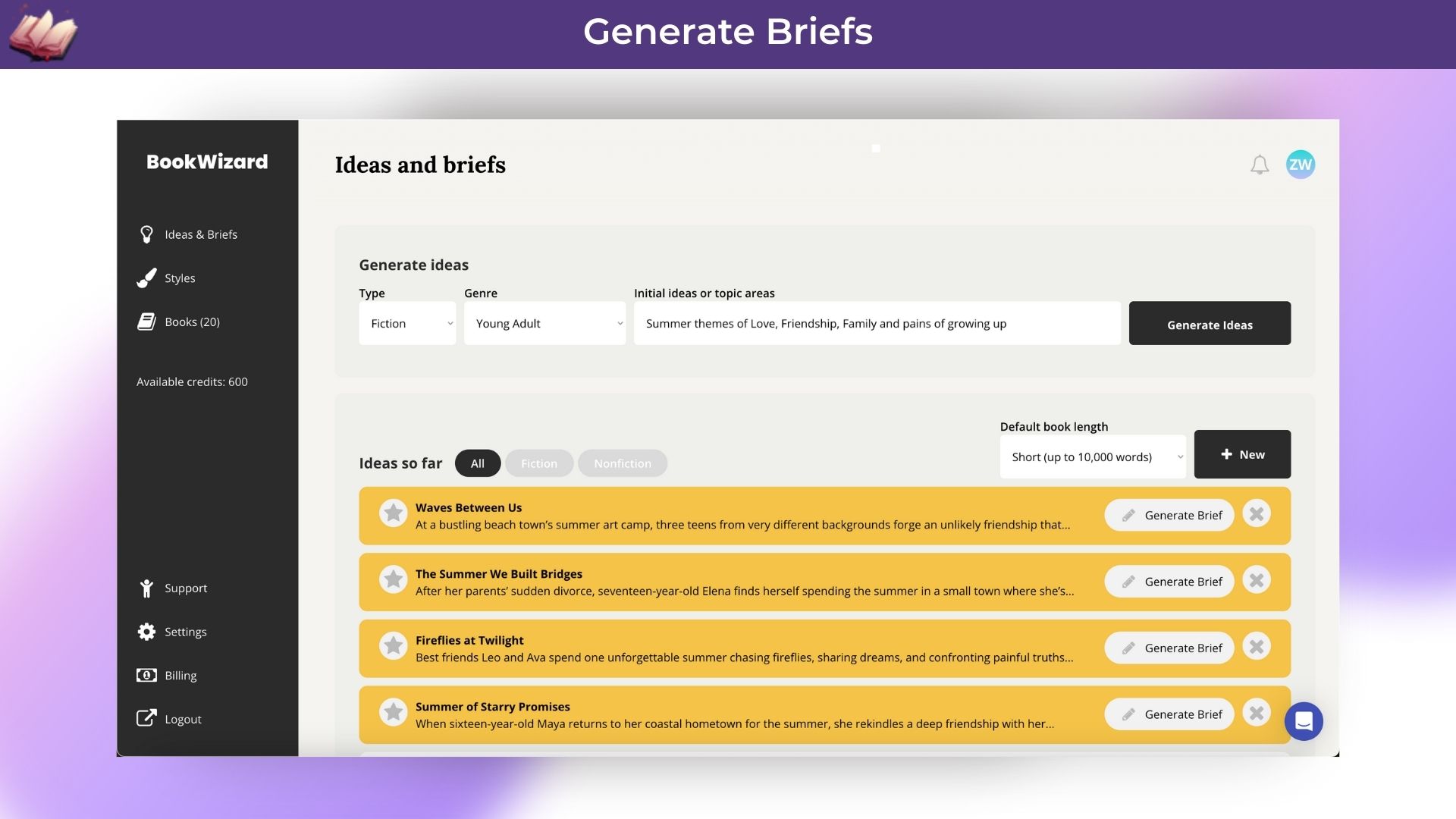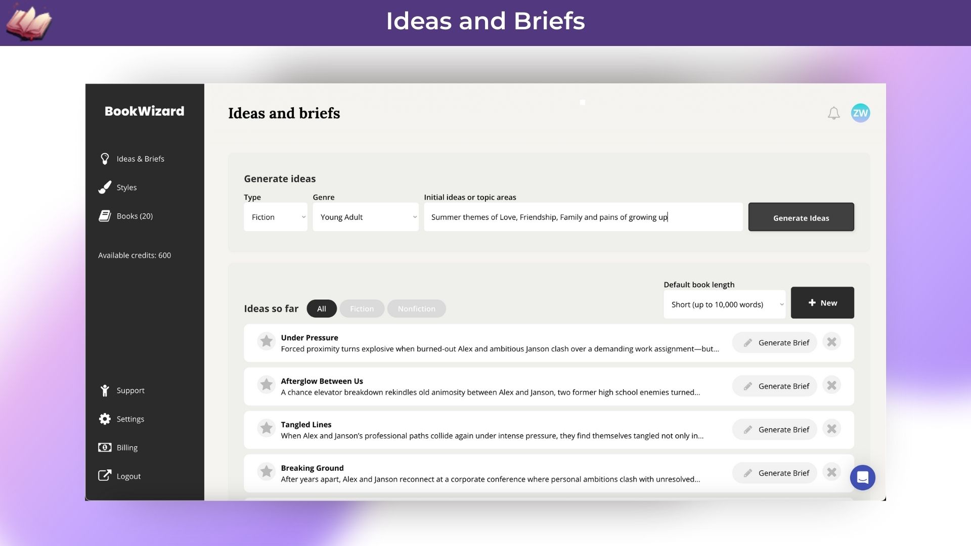 Create unlimited book ideas, outlines & content briefs