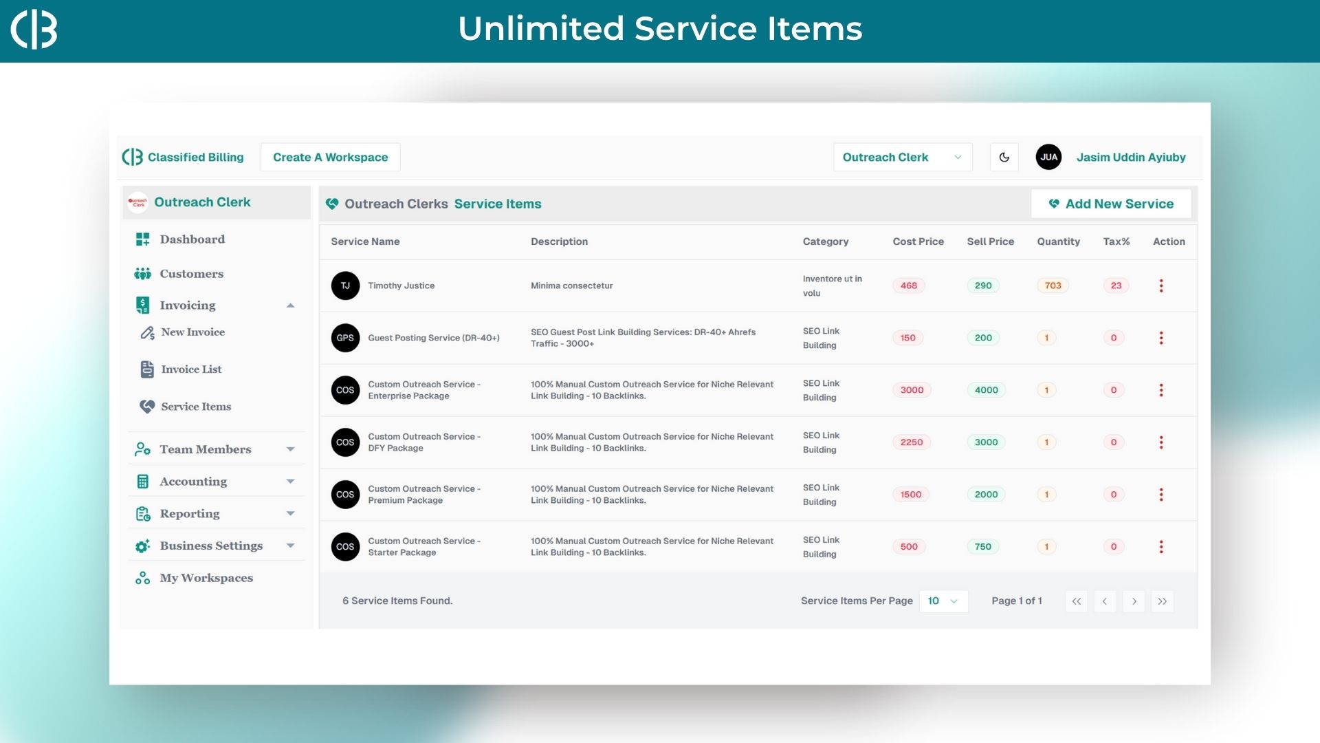 Service Item Mastery: Create unlimited service items with detailed descriptions and flexible pricing options.