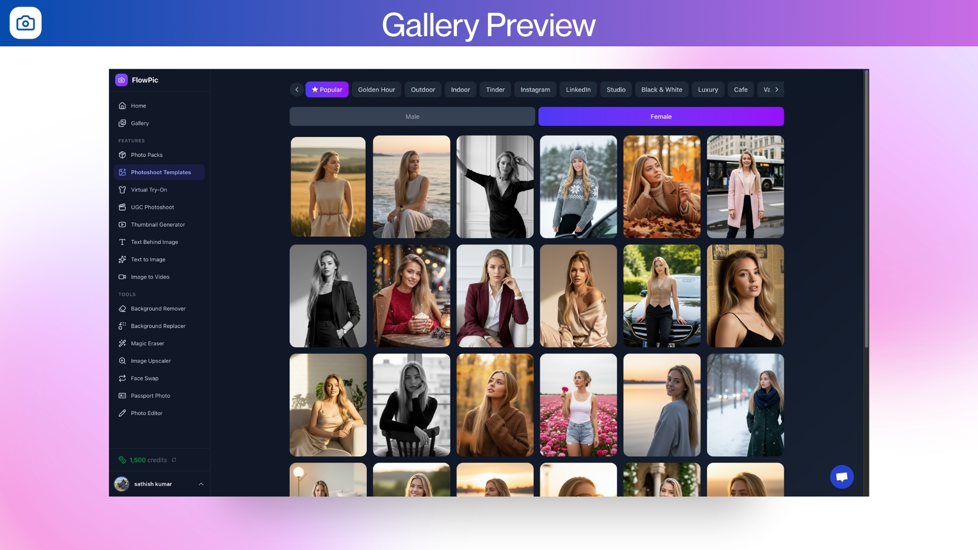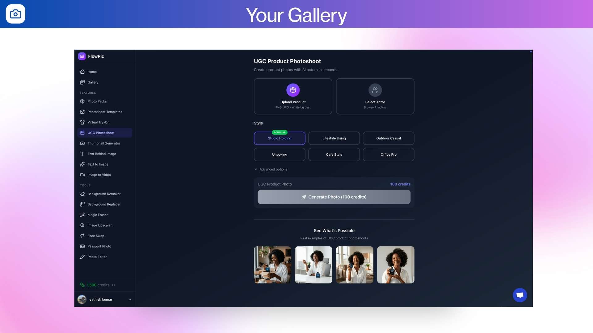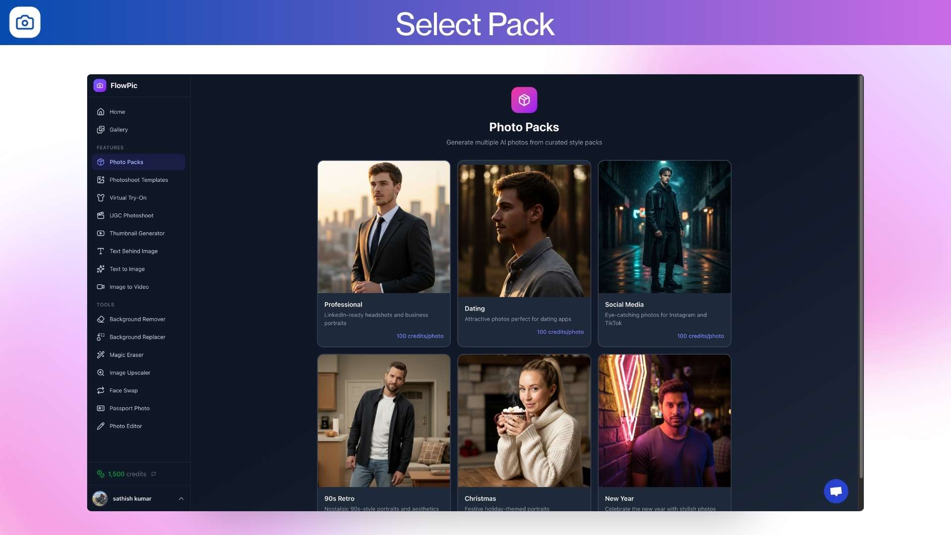 Use Photo Packs to batch-generate 5–20 images at once, choose from 1,000+ AI photoshoot styles, or try clothes with Virtual Try-On.Â
