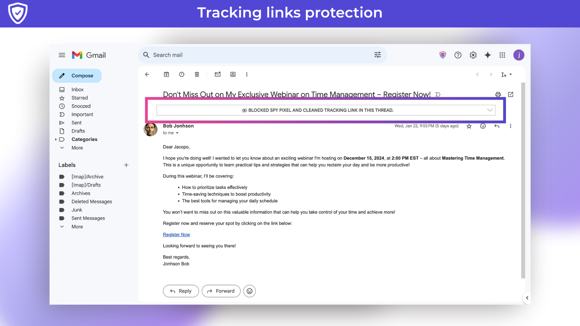 – By blocking email trackers, you can reply confidently, assured that the sender can’t collect data about your email interactions: They don’t know when you opened their email, how many times you viewed it, or if you clicked on any links.