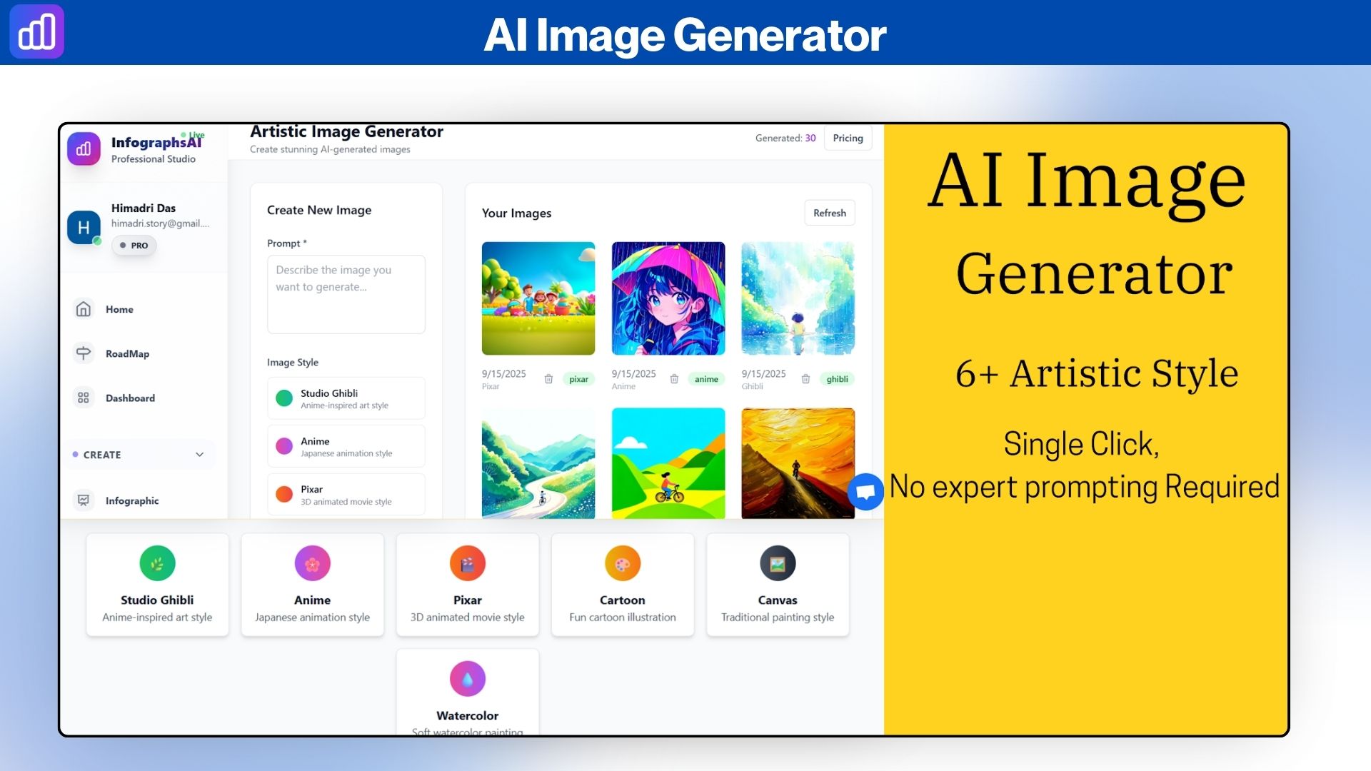 Instantly create stunning visuals in 6 artistic styles (Studio Ghibli, Anime, Pixar 3D, Cartoon, Canvas, Watercolor) from simple text. Perfect for presentations, marketing, social media, and creative projects with no design skills required.