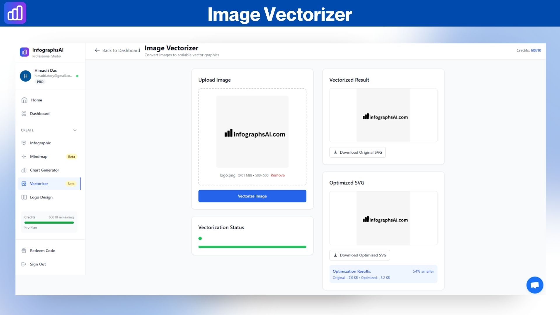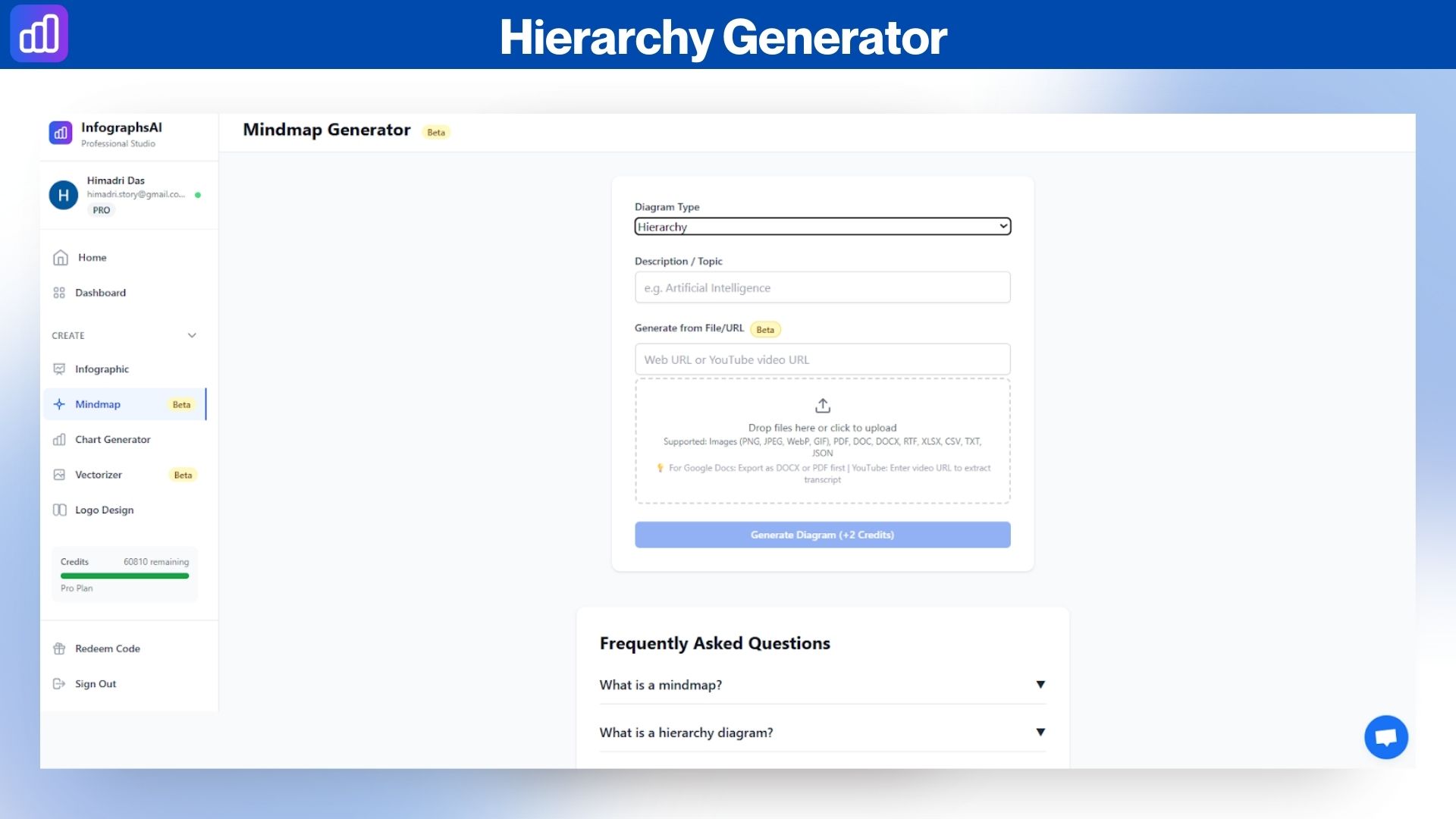 InfographsAI is a complete creative AI visual creation suite that transforms any idea, input, topics, text, PDFs, Excel files, CSV data, website URLs, YouTube URLs, and images into professional infographics, charts, logos, AI Image, mind maps, hierarchies, and scalable vector graphics.