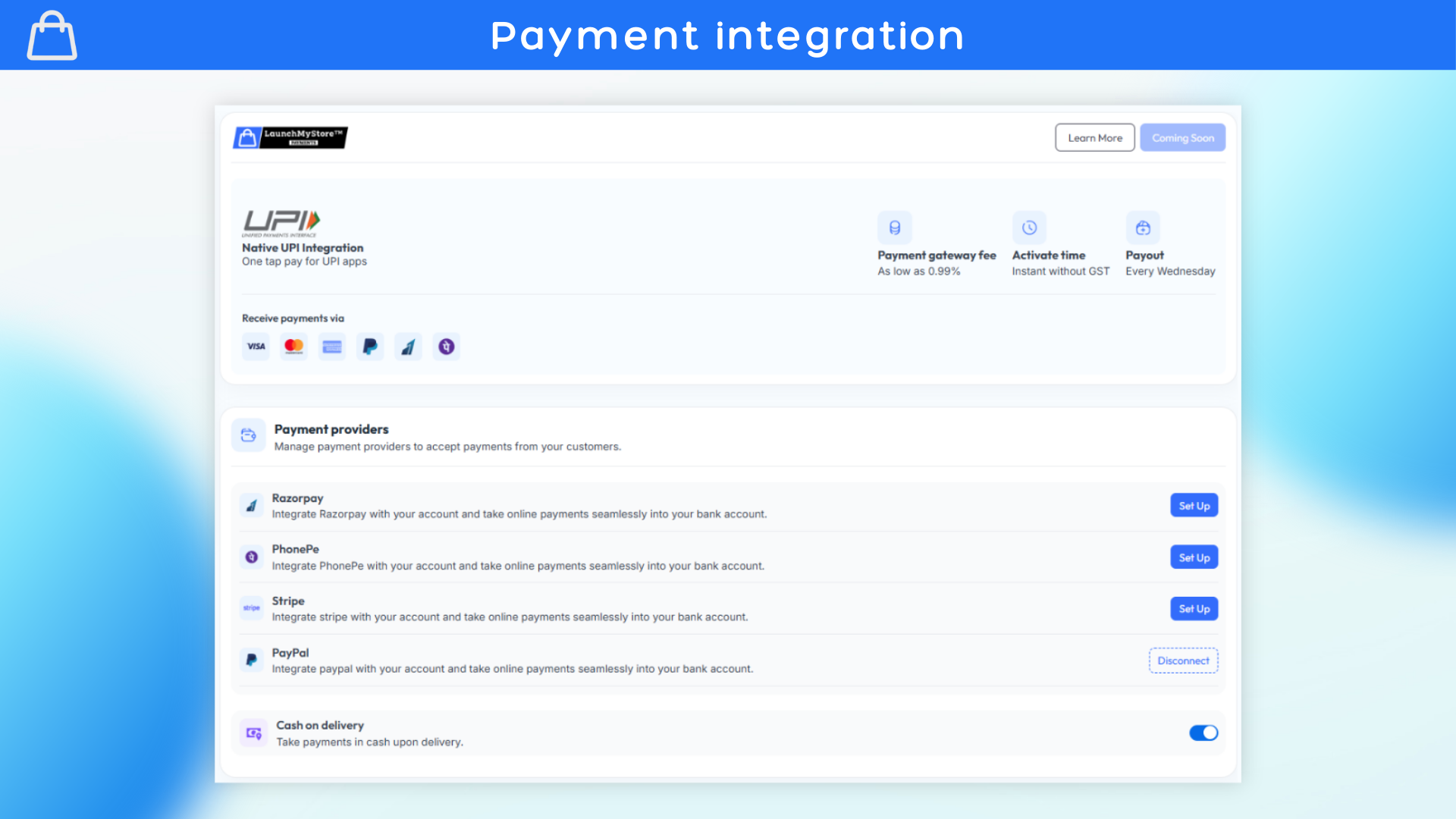 Seamless Payment Integration: Set up Stripe, Razorpay, PayPal, PhonePe and more.