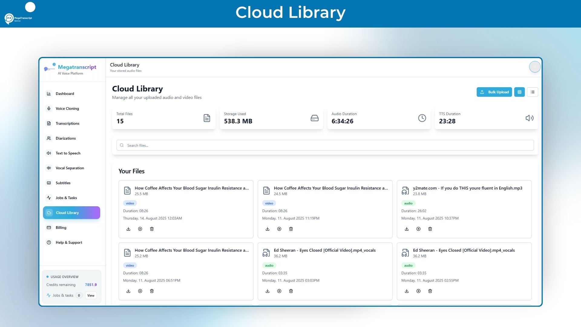 – You can upload audio files by clicking the ‘Upload Audio’ button on the Transcriptions page. We support MP3, WAV, M4A, and other common audio formats.
