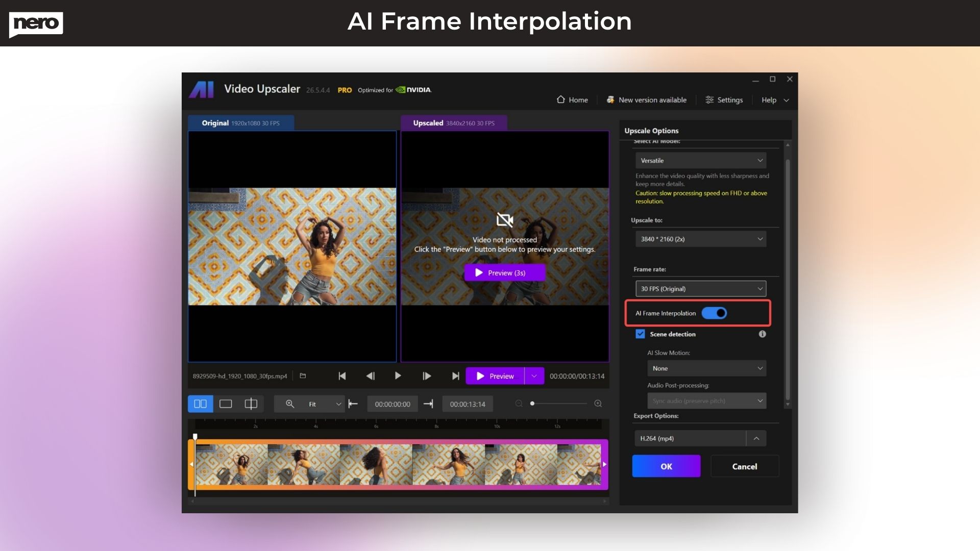 Its AI frame interpretation analyzes your video frames and fills in the gaps to increase the frame rate, making your videos look smoother and more fluid. Nero’s new version 2026 also provides a face enhancement model, video color adjustment, and upscale preset that lets you craft your own presets or choose from factory presets to start your project quickly.