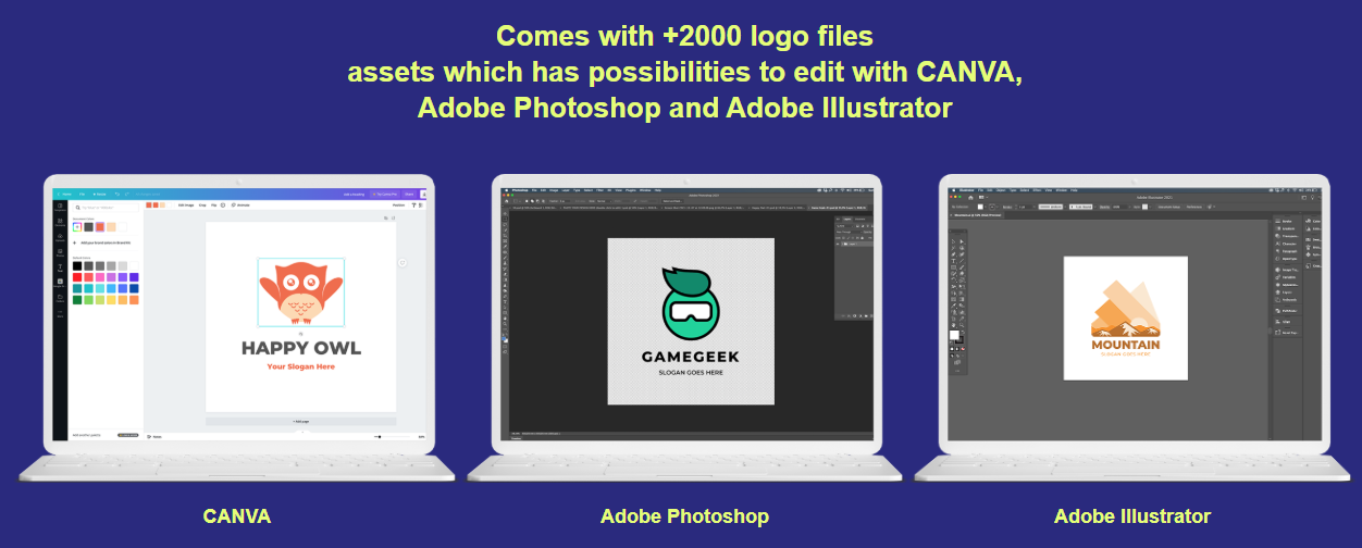 – You only need PowerPoint to edit the logo templates. Also, the logo files are compatible to edit with Adobe Illustrator, Adobe Photoshop and CANVA.