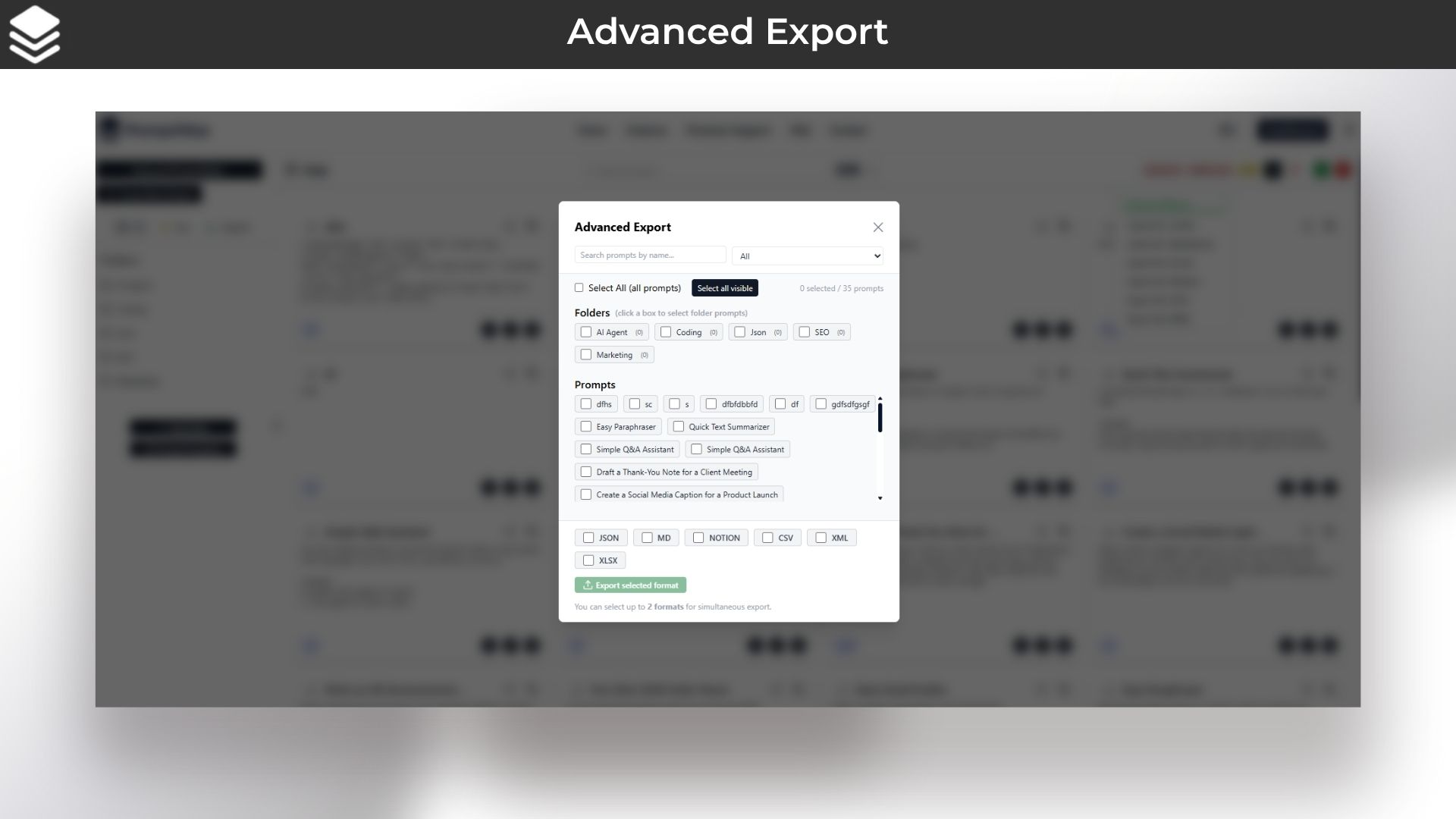 Bring in prompts from TXT, PDF, JSON, Markdown, Notion, CSV, DOCX, and more. Export your work in any format you need.