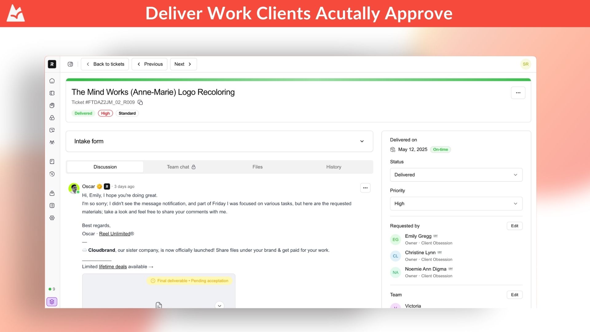 With Prorequests, managing deliverables becomes dramatically simpler. Assign team members to specific projects, then upload your deliverables from any tools you already use—like Figma, Canva, and Google Docs—so clients can provide feedback without platform-hopping.