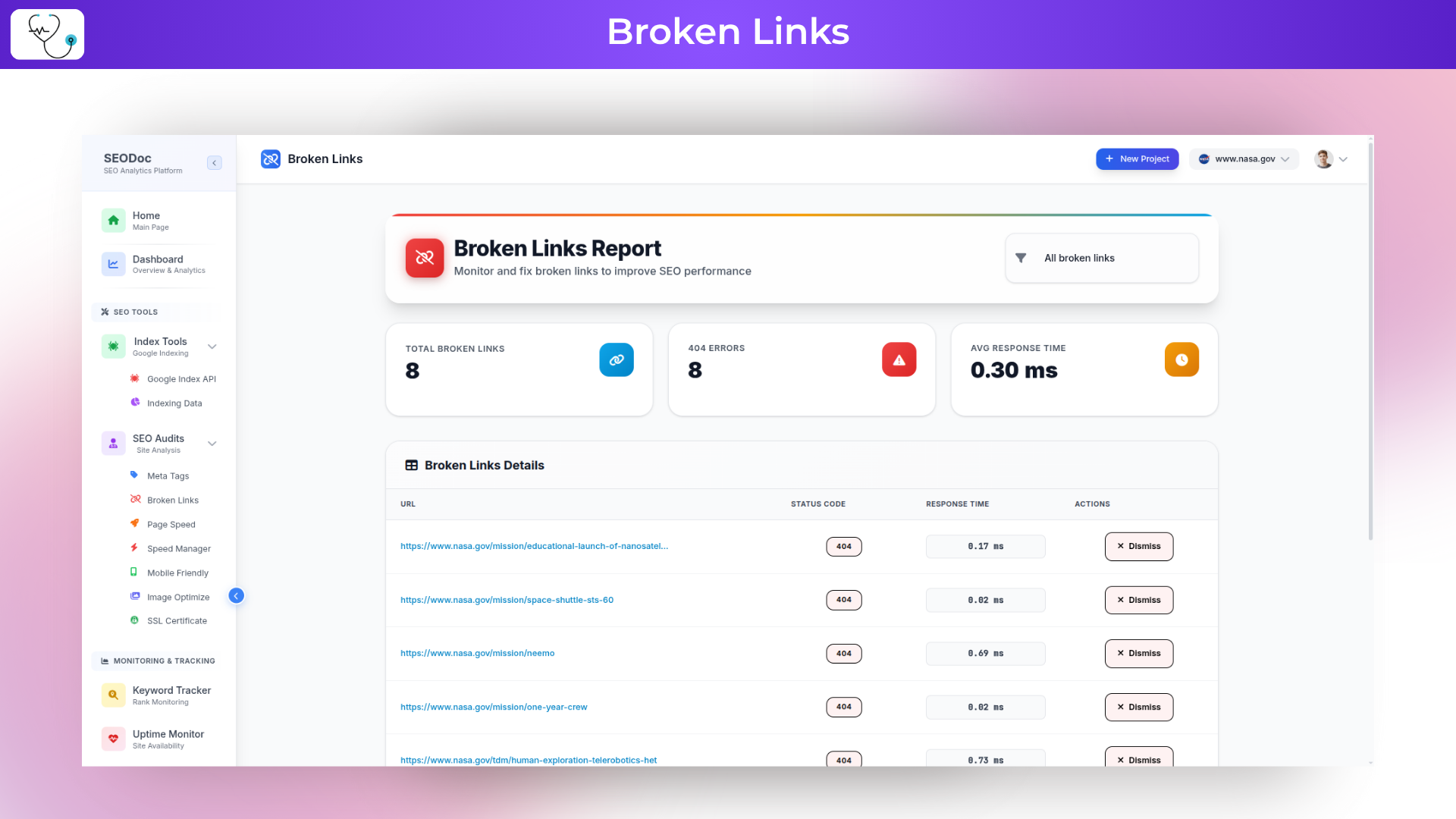 – Perform deep site crawls to uncover hidden pages and issues. Identify and list broken internal and external links, with exportable logs for developer handoff.
