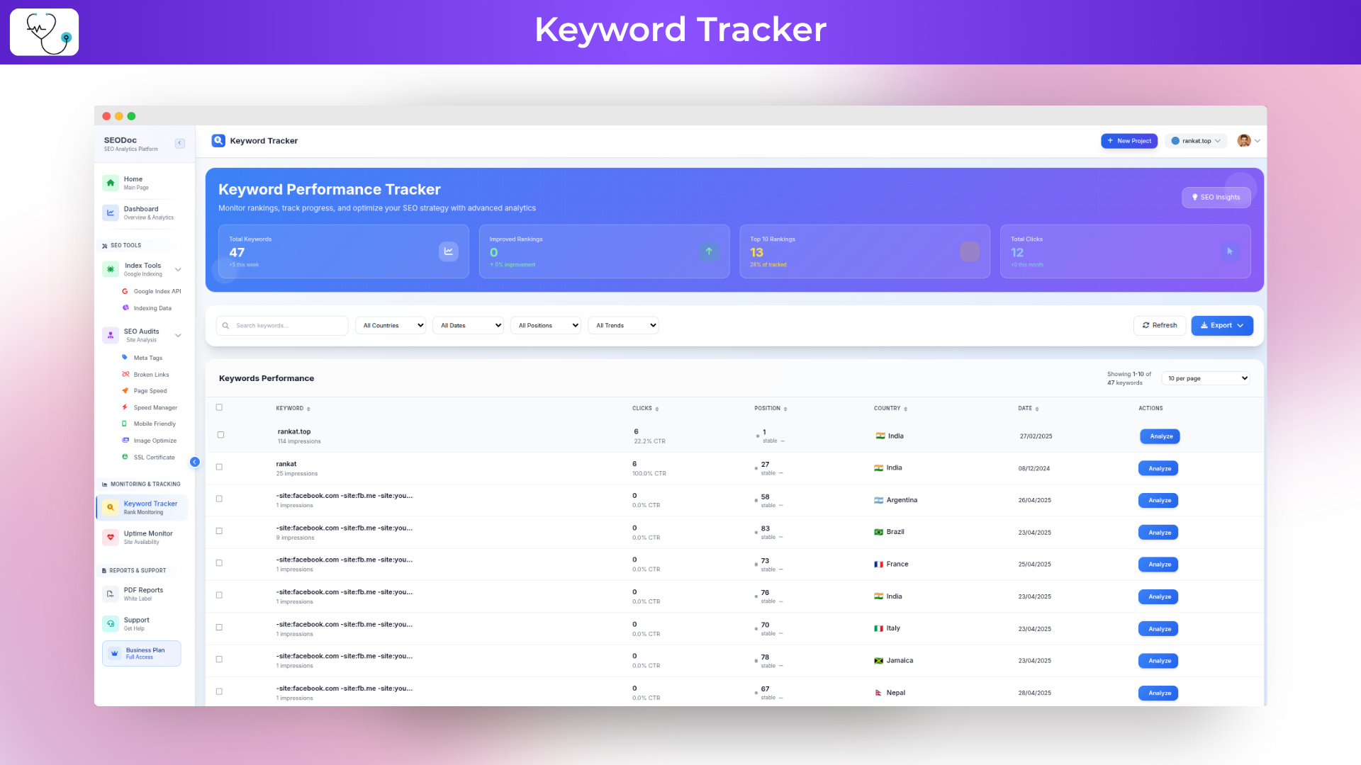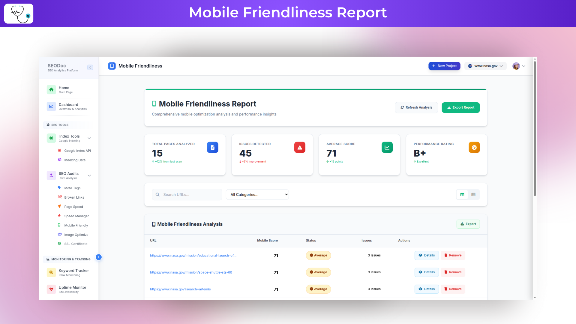 – SEODoC.io centralizes all essential SEO operations in one dashboard, including technical audits, keyword tracking, Core Web Vitals analysis, uptime monitoring, bulk operations, reporting, and more.
