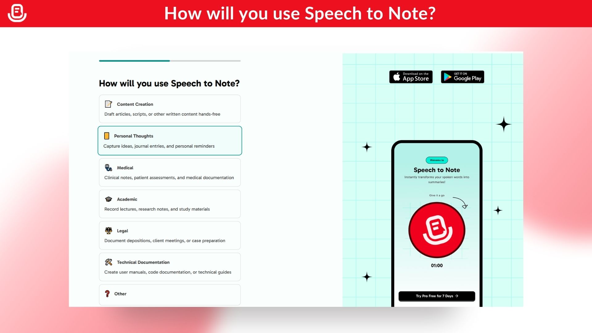 -Speech to Note is a voice-first note-taking application that converts your spoken words into text notes. It allows you to capture ideas, observations, and meeting notes on the go.