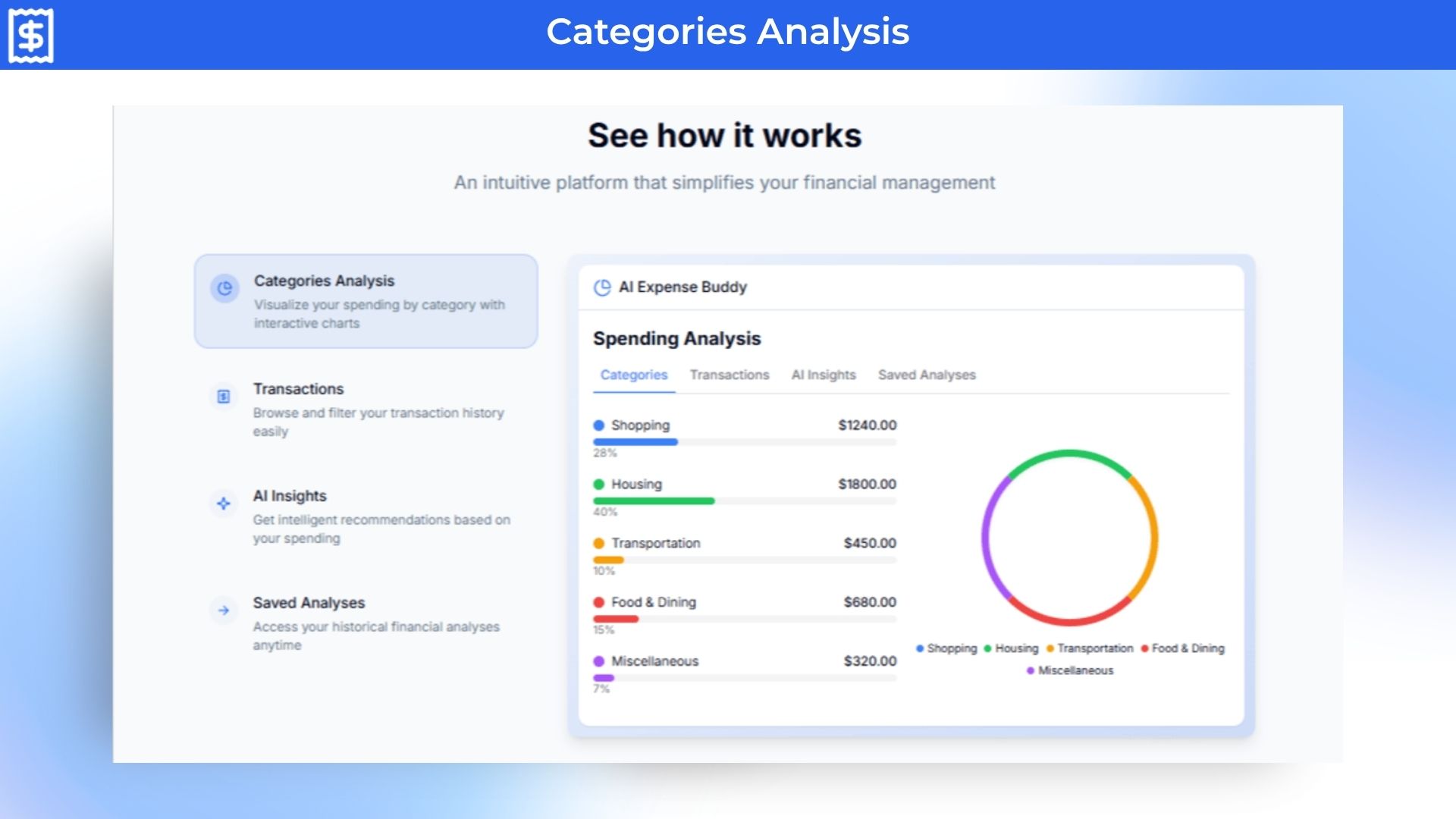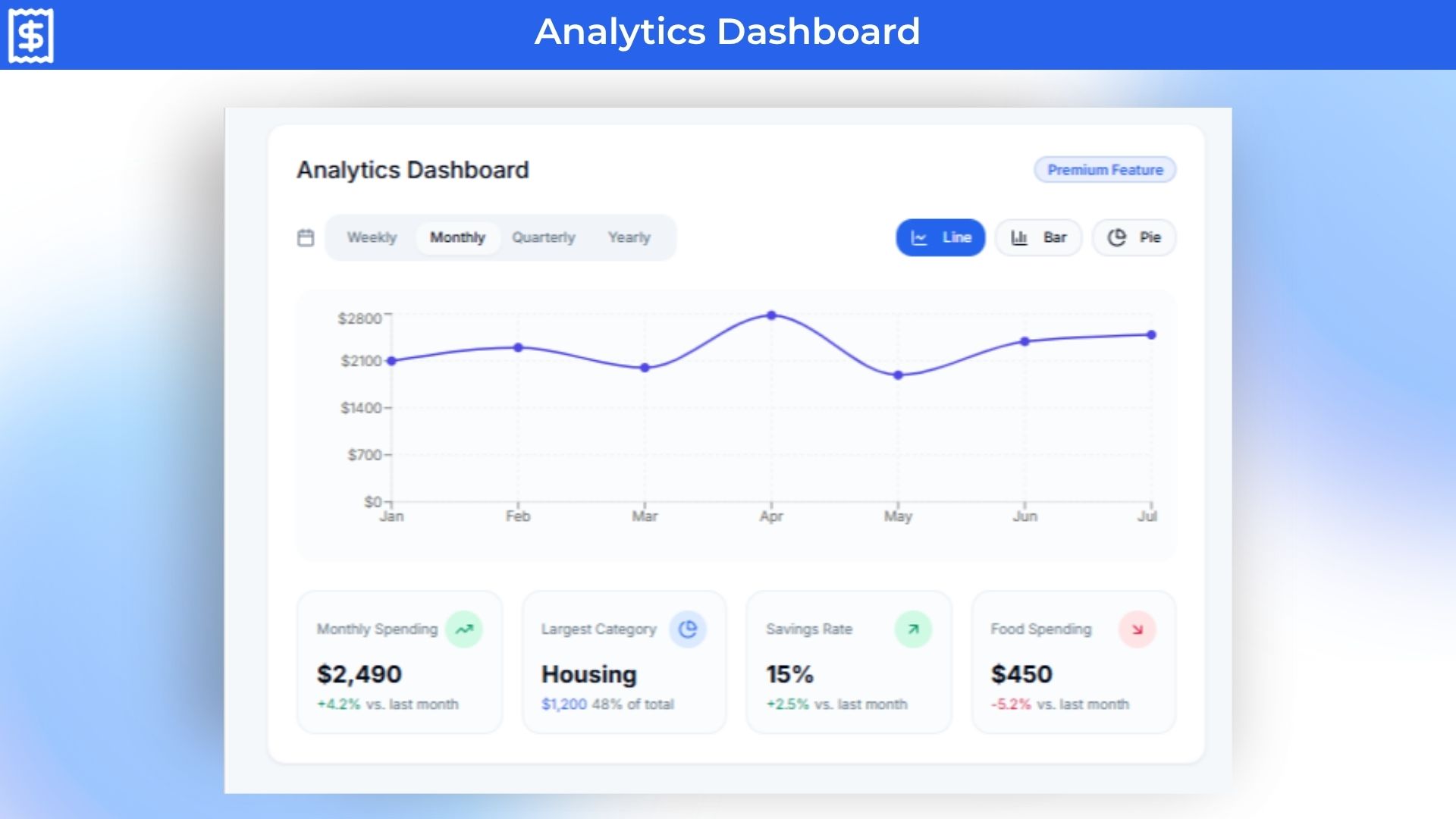 – Visualize your spending with interactive charts. See how much goes to Housing, Food, Shopping, Transportation, and more—instantly identifying budget leaks with clarity.