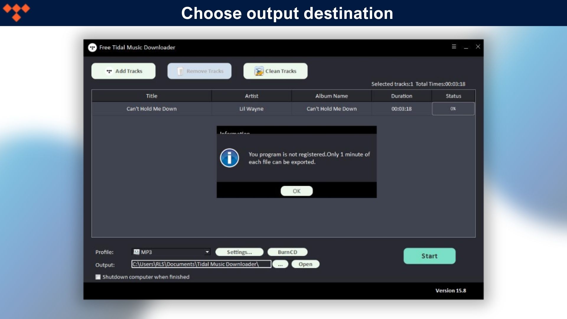 Step 3: Choose output destination and then click “Start” and it will start to download and convert Tidal songs, playlists, albums and Podcasts to MP3, AC, FLAC, WAV, AIFF, ALAC, AUTO and other common audio files.