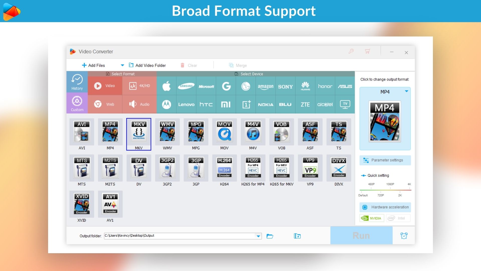 Supporting over 500 presets, it enables seamless conversion of HD and SD videos to a wide range of file types compatible with smartphones, tablets, game consoles, and more. Equipped with GPU acceleration technology, it significantly speeds up the conversion process without compromising quality.